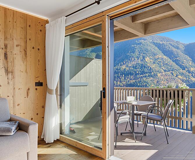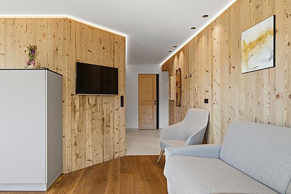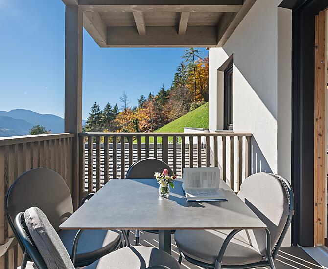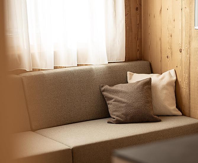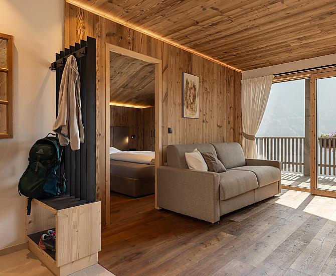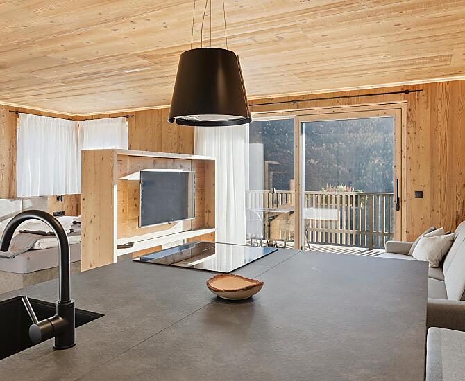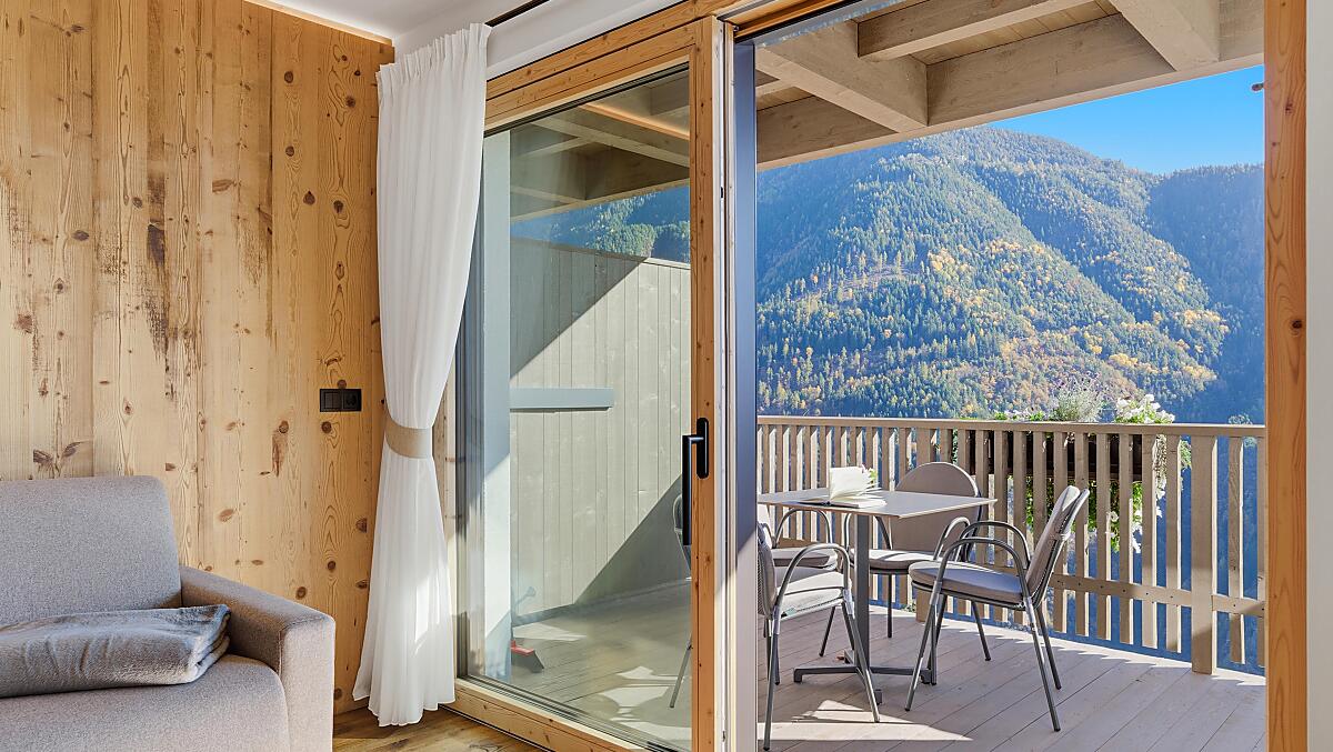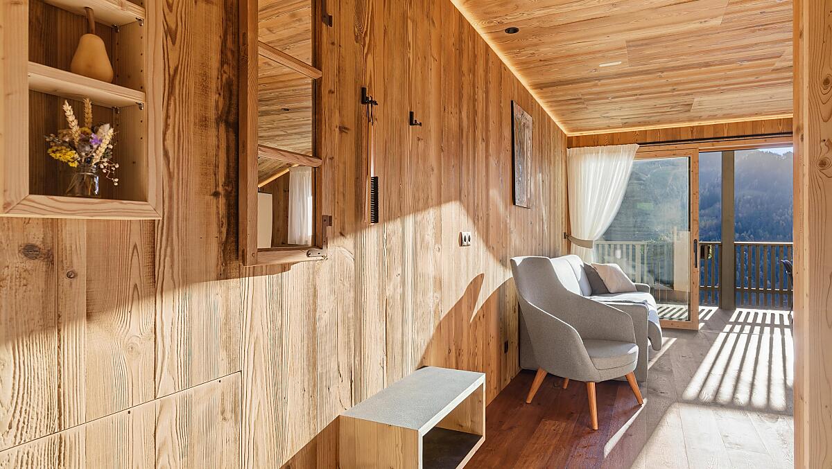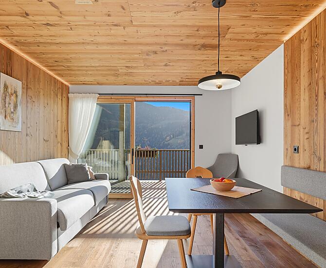 Gli appartamenti, arredati con cura e dotati di terrazza privata, coniugano il comfort moderno con l’atmosfera autentica di un maso di montagna. L’area esterna curata nei dettagli e la zona benessere con sauna e sala relax invitano a prendersi una pausa rigenerante per il corpo e lo spirito.