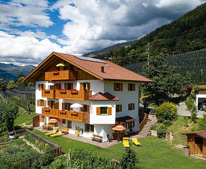 Il nostro maso frutticolo è situato in mezzo ai meleti ed ha una magnifica vista sulle montagne circostanti. Gli appartamenti, arredati con cura e praticità, offrono un'atmosfera accogliente. Grazie alla nostra posizione sopra la conca di Merano, è un gioco da ragazzi esplorare l'Alto Adige con tutti i suoi sentieri escursionistici e le sue attrazioni culturali o semplicemente rilassarsi. Le migliori condizioni per una vacanza rilassante e varia.