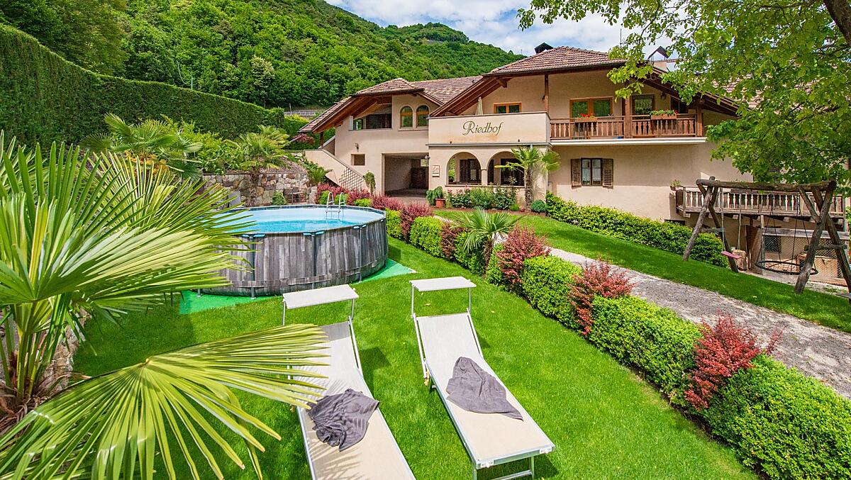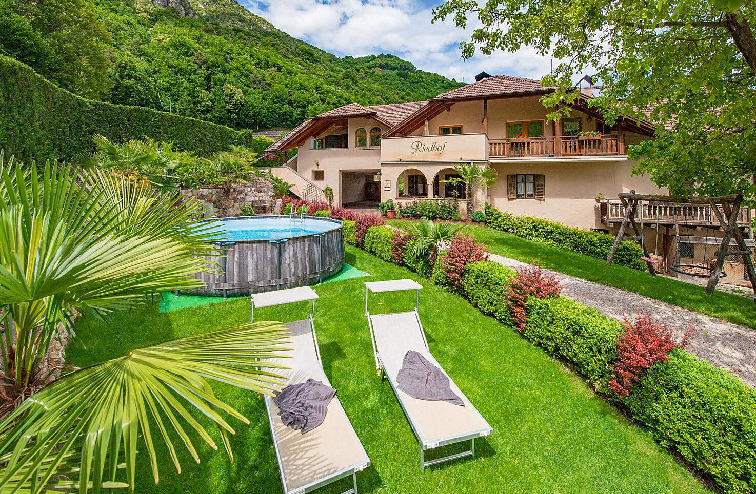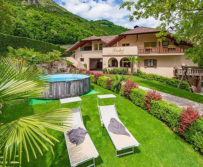 Il Maso Riedhof è situato nel suggestivo sud dell'Alto Adige, a Cortaccia, a 600 metri di altitudine. Circondato dai nostri vigneti di Müller-Thurgau e Sauvignon, il nostro maso offre un ampio cortile curato, con diverse aree relax e una zona barbecue sotto un pergolato verde. Per i più piccoli c’è un parco giochi e, nei mesi estivi, una piccola piscina per rinfrescarsi. Il maso comprende anche un giardino con una zona dedicata alle erbe aromatiche.