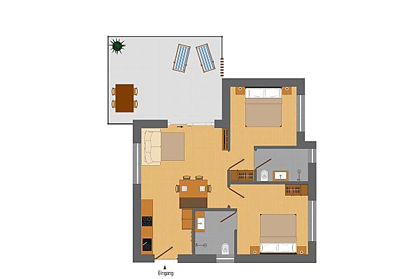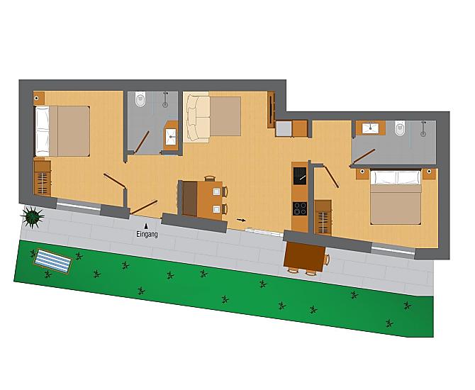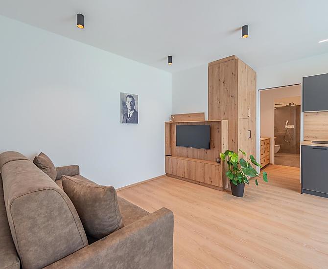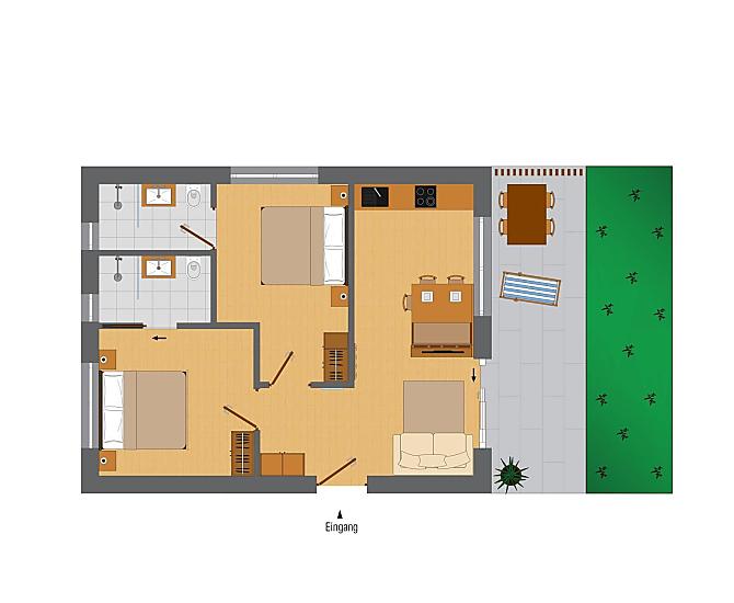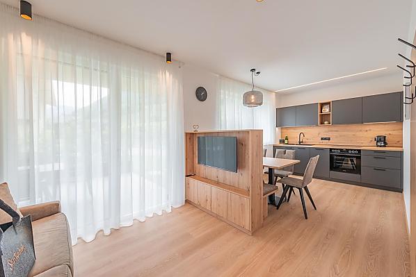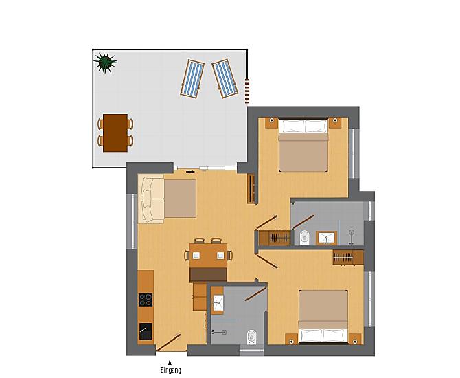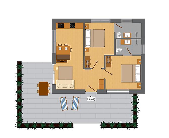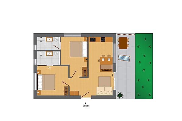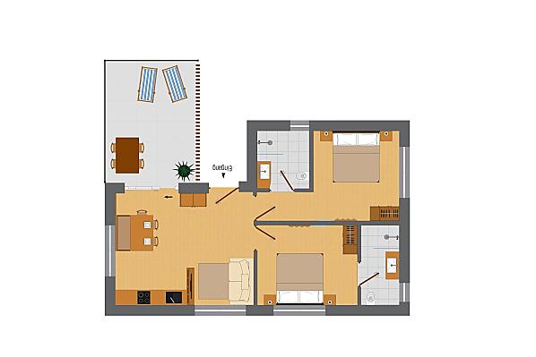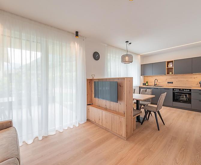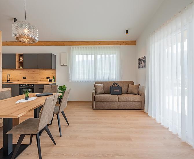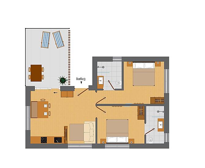 Vi aspettano 5 appartamenti moderni, accoglienti e completamente attrezzati, ciascuno con terrazza, 2 camere da letto e 2 bagni.