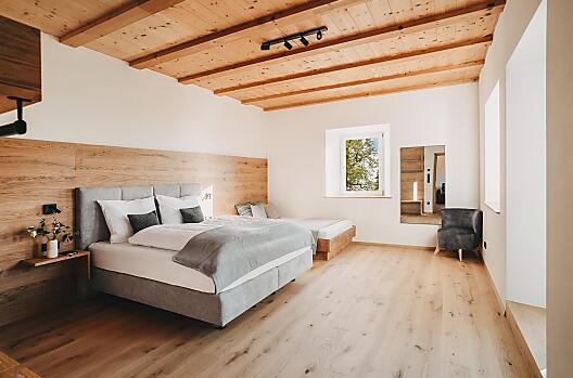 Nei masi in Alto Adige non si coltivano solo prati e campi. Molti masi si prendono cura anche di un pezzo di foresta. Il legno dei propri alberi è una materia prima preziosa per l'arredamento naturale degli appartamenti e delle camere di vacanza. A volte il contadino stesso diventa falegname e produce con le proprie mani l'arredamento di alta qualità. I mobili in legno massiccio non solo danno agli alloggi un'atmosfera speciale, ma hanno anche un tocco molto personale. I pavimenti in legno hanno una lunga tradizione nelle fattorie altoatesine. Le tavole naturali danno una sensazione di sicurezza. Immaginate di camminare a piedi nudi sul caldo pavimento di legno dopo una fredda giornata invernale e di lasciarvi sprofondare in un morbido cuscino di loden. Manca solo il rilassante crepitio della stufa a legna e l'esperienza di vacanza è perfetta.