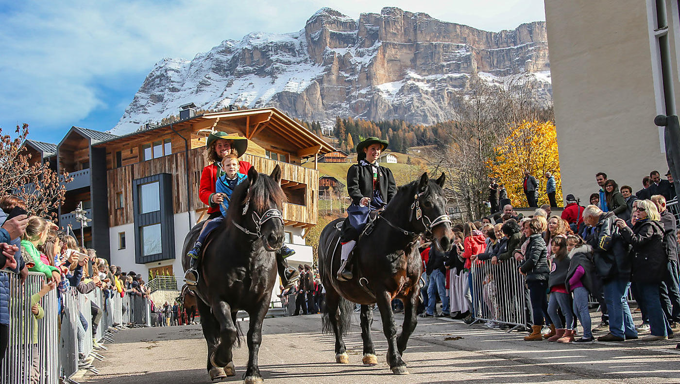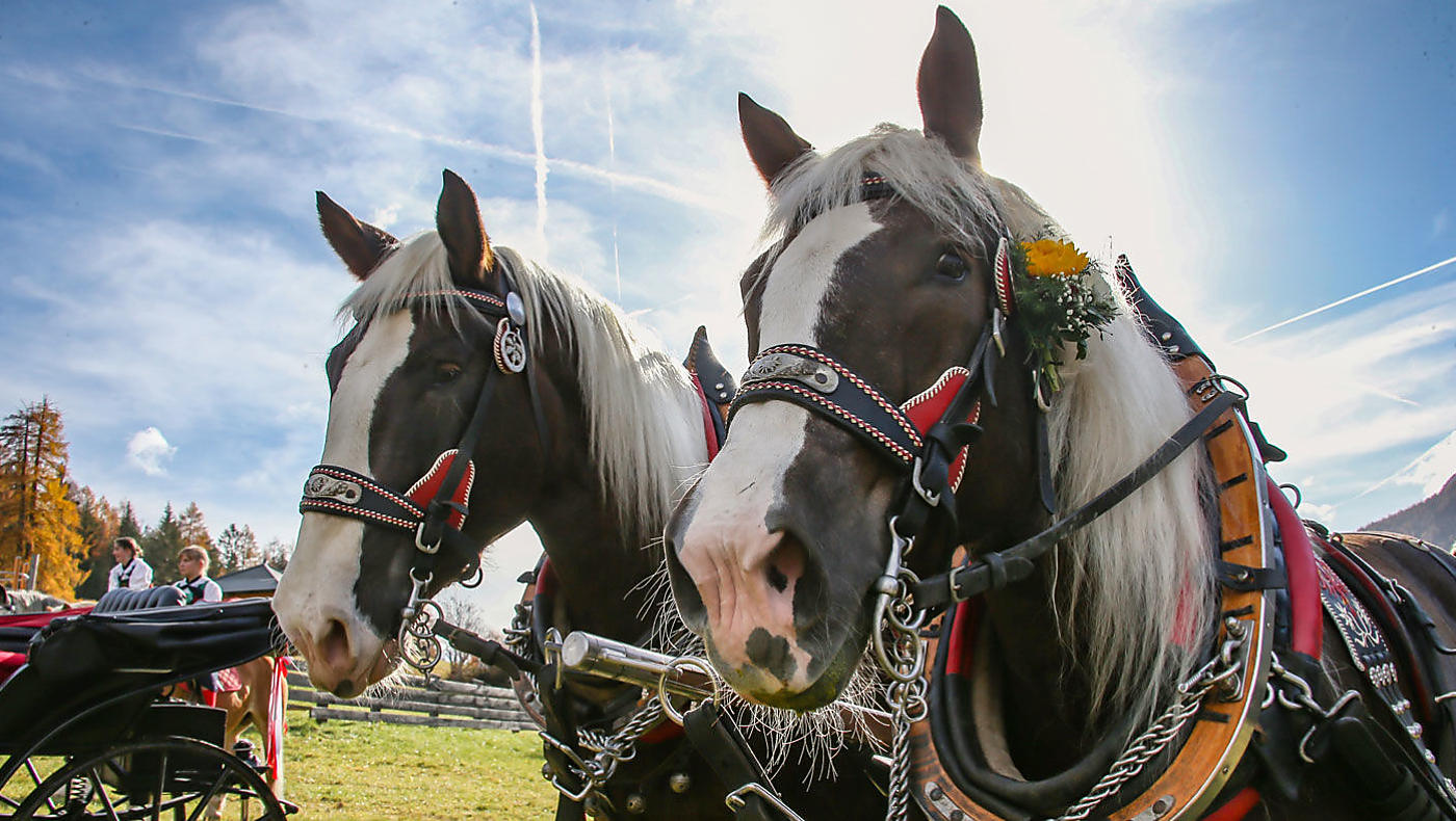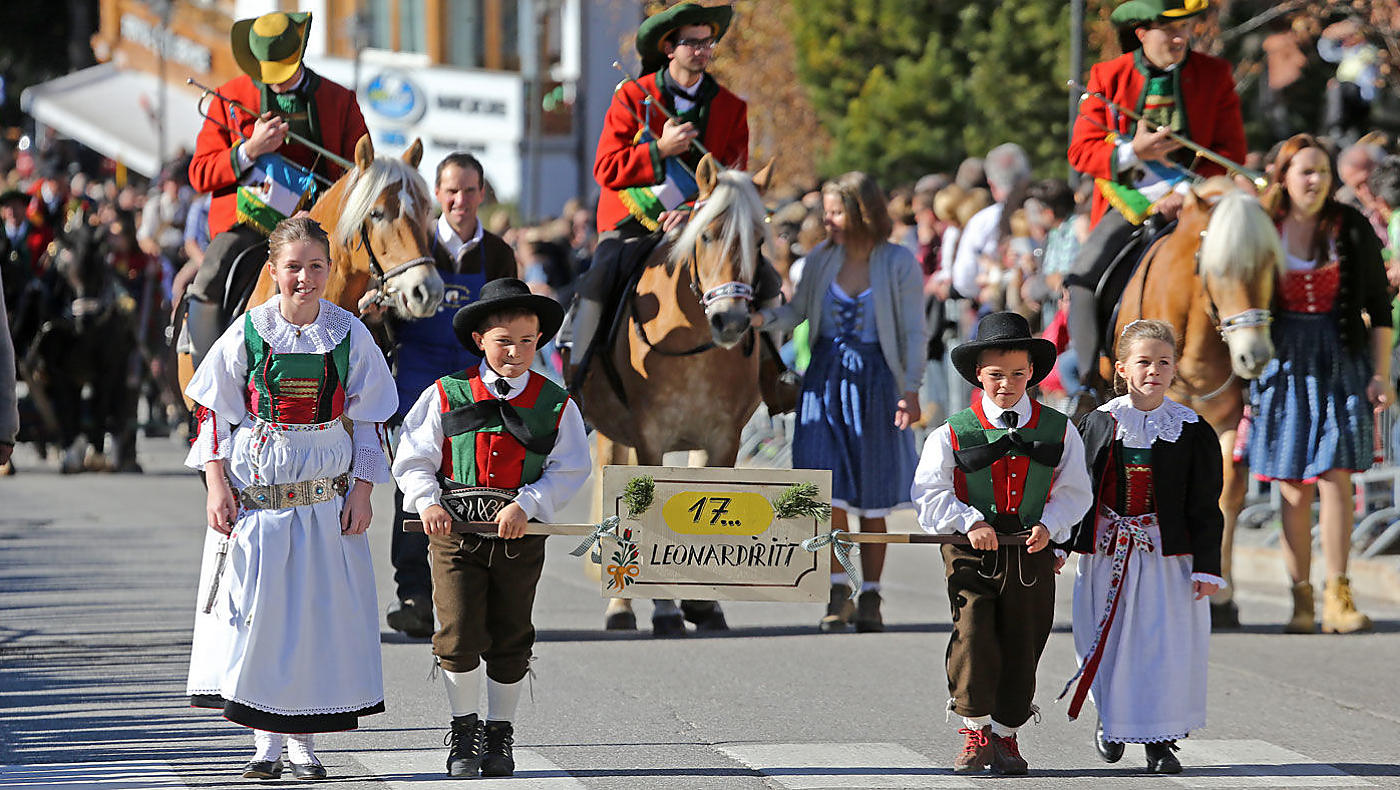 Tradizione e costumi giocano un ruolo importante nella Cavalcata di San Leonardo in Alta Badia. Figuranti in costumi ladini, carrozze splendidamente decorate e cavalli avelignesi e Noriker decorati a festa partecipano al corteo. Dopo la processione, i cavalli e gli allevatori vengono benedetti.