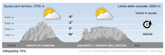 Le nubi residue tenderanno a dissolversi ed in giornata in cielo si alterneranno tratti soleggiati e nuvolosità di tipo cumuliforme. Tratti soleggiati più ampi interesseranno le vallate maggiori. Nelle ore più calde saranno possibili dei rovesci in montagna.