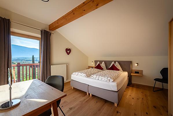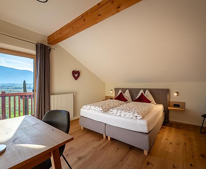 Il nostro maso, circondato da vigneti di proprietà, si trova all'ingresso di Montagna a circa 500 m sul livello del mare. Offre una magnifica vista sull'intera Valle dell'Adige a sud, mentre a est si può ammirare il villaggio di Montagna. Coltiviamo frutta e vino. Le nostre varietà di mele sono Gala, Fuji e Pink Lady, mentre le varietà di uva sono Pinot Nero, Gewürztraminer e Merlot. Il clima soleggiato e mite ha un effetto favorevole sulla coltivazione.