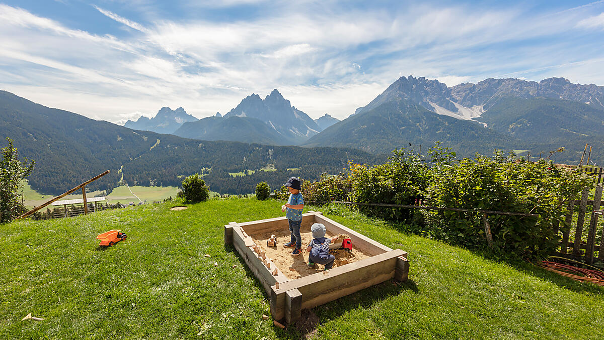 Davanti a uno sfondo da cartolina, i bambini giocano a San Candido, in Alta Pusteria. Il parco giochi naturale è incorniciato da uno splendido panorama sulle Dolomiti.